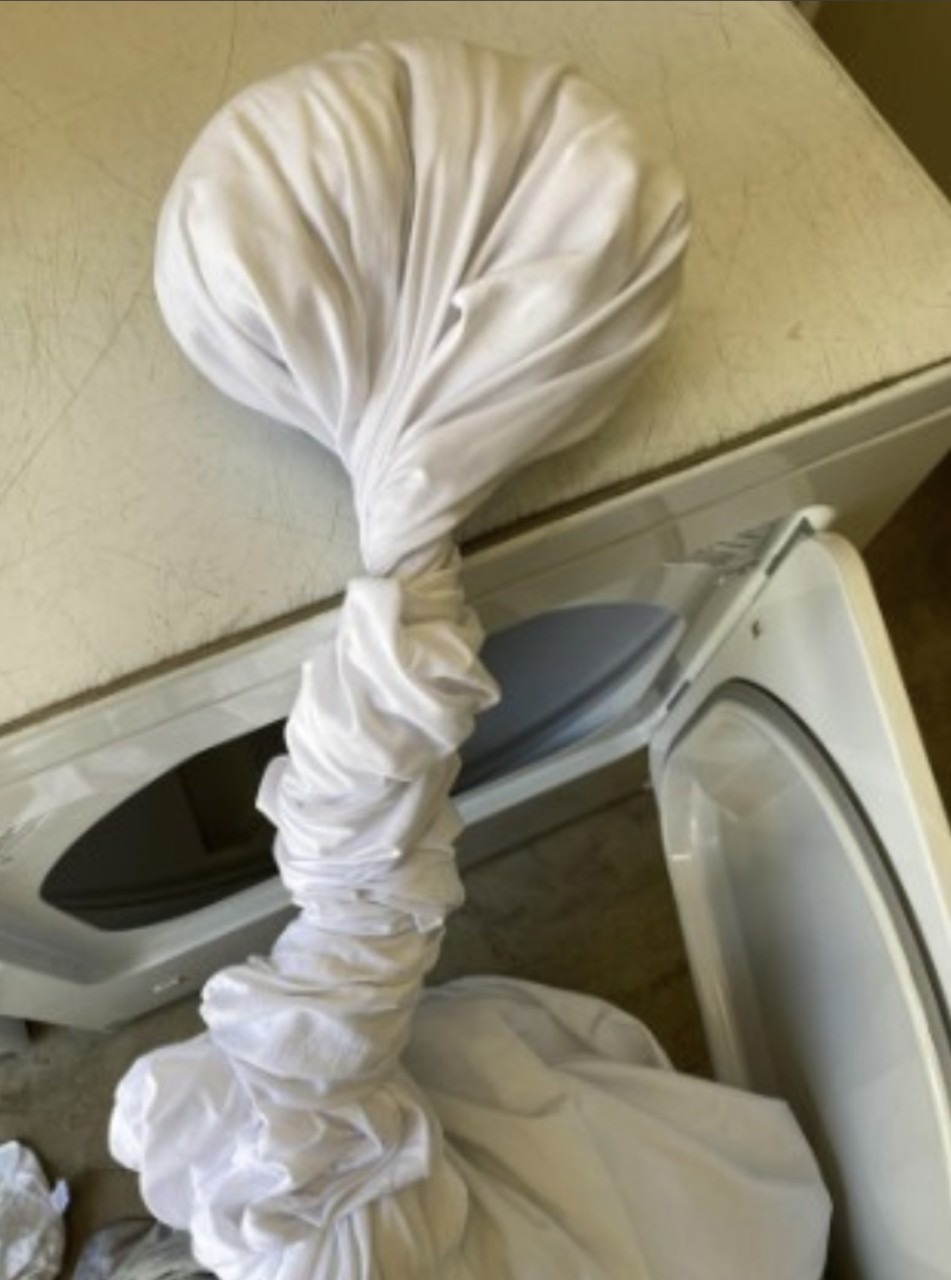• Terwijl de droger draait, verandert die klomp in een grote, gedraaide knoop.