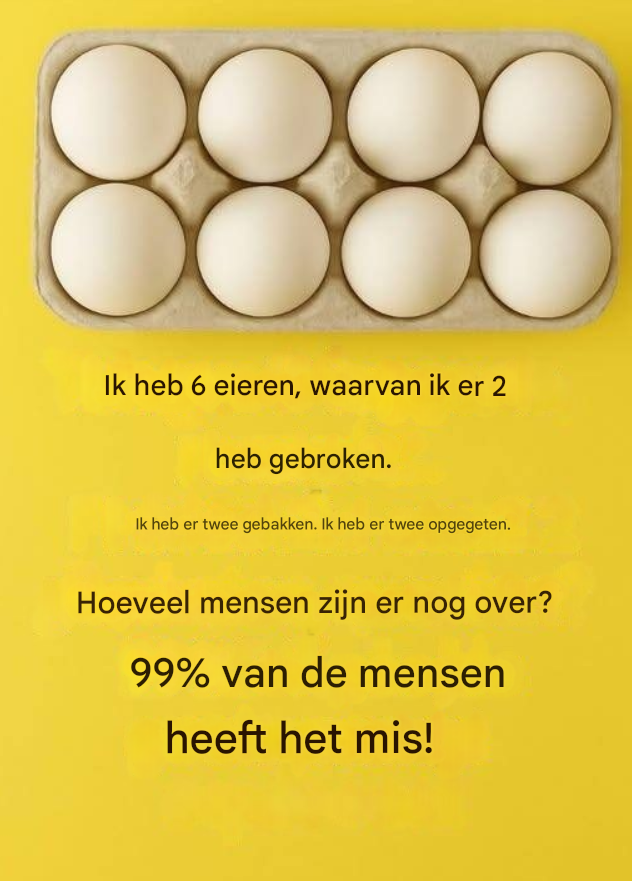 « Ik heb 6 eieren. Ik heb er 2 gebroken. Ik heb er 2 gebakken. Ik heb er 2 opgegeten. Hoeveel eieren heb ik nog over? »