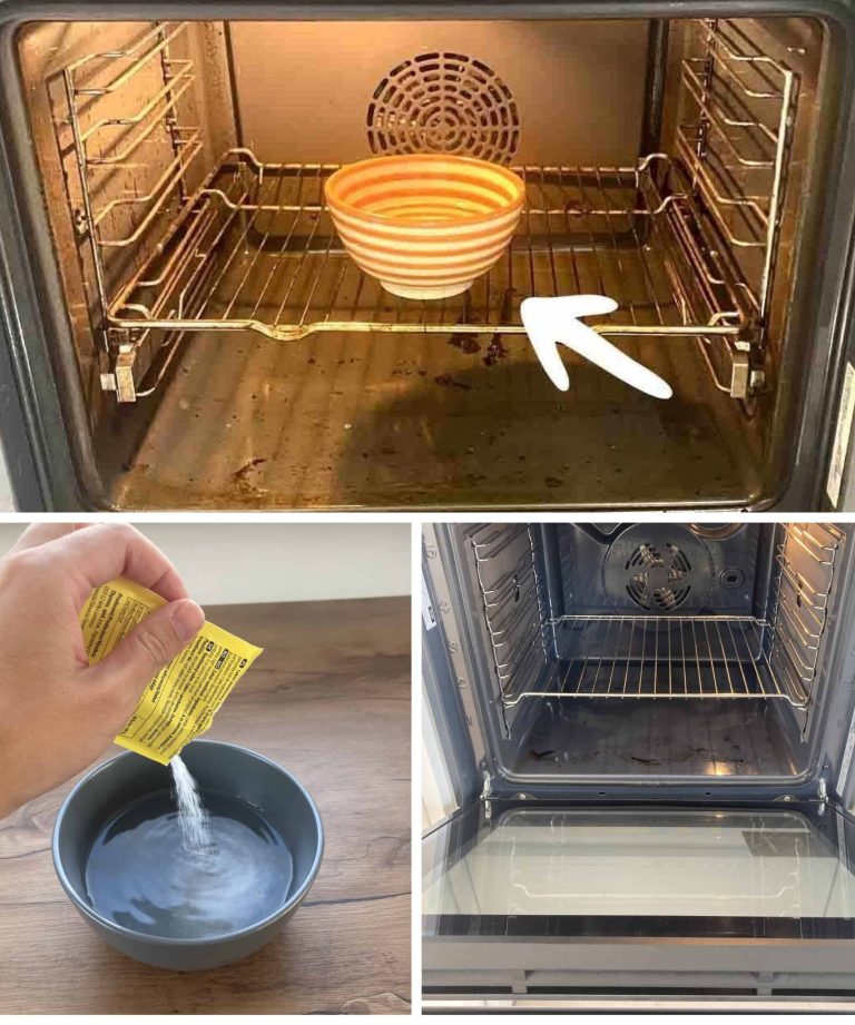 Deel 2: De briljante water- en azijntechniek: Ontdek een eenvoudige maar krachtige methode die vet moeiteloos oplost. Het enige wat je nodig hebt is een vuurvaste schaal, een beetje water en twee glazen azijn. Maak de oven leeg, verwijder de roosters en verwarm gedurende 10 minuten voor op 180°C. Kook het water en de azijn, zet de oven uit, giet het mengsel in een kom en plaats deze erin. Laat het 30 minuten intrekken terwijl de stoom uit de oplossing het opgehoopte vuil verzacht.