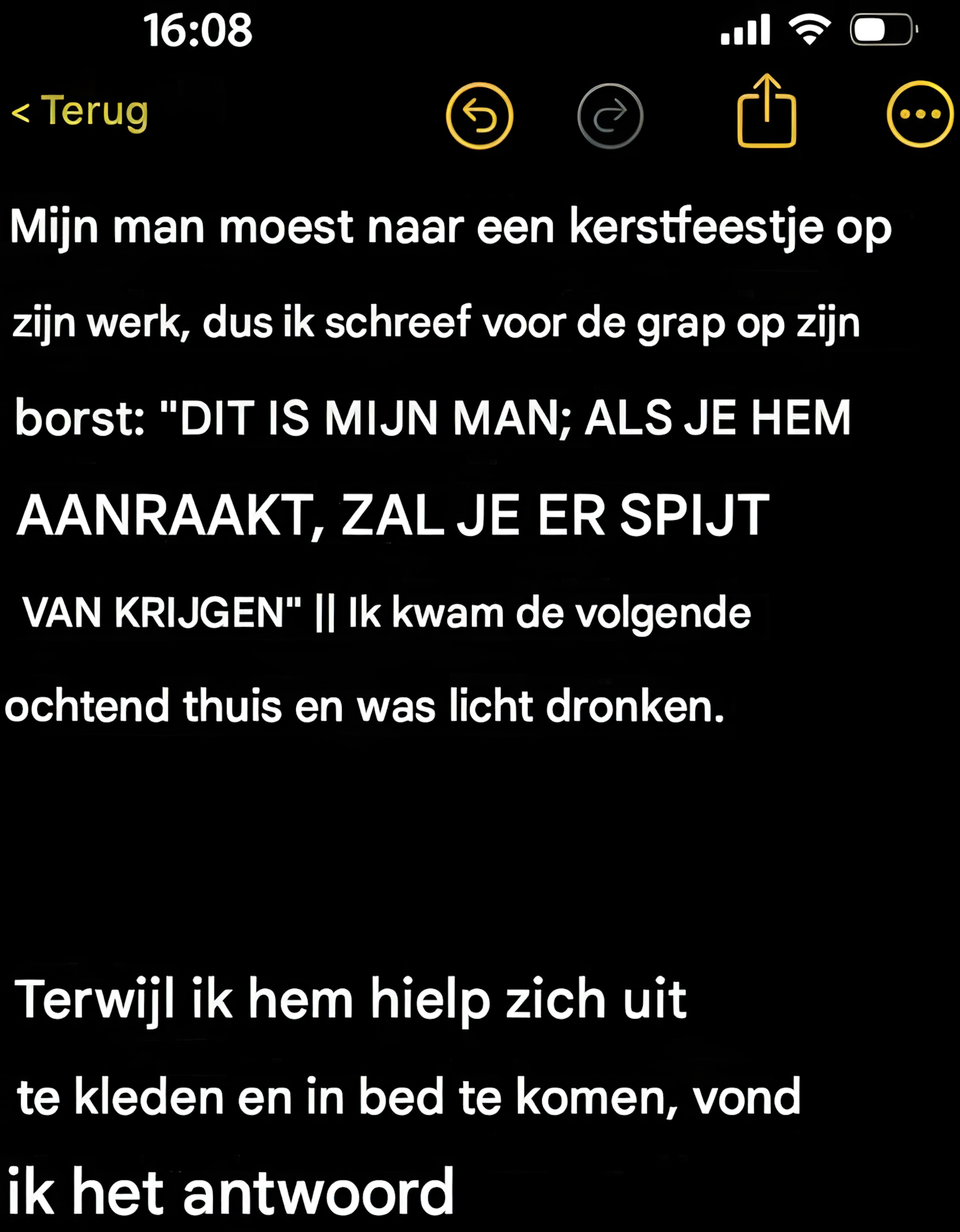 Ik keek hem aan en wist dat hij dronken was. Ik liep met hem naar onze kamer, met de bedoeling hem uit te kleden en naar bed te brengen. Maar terwijl ik hem hielp uitkleden, vond ik een antwoord op mijn wazige bericht.