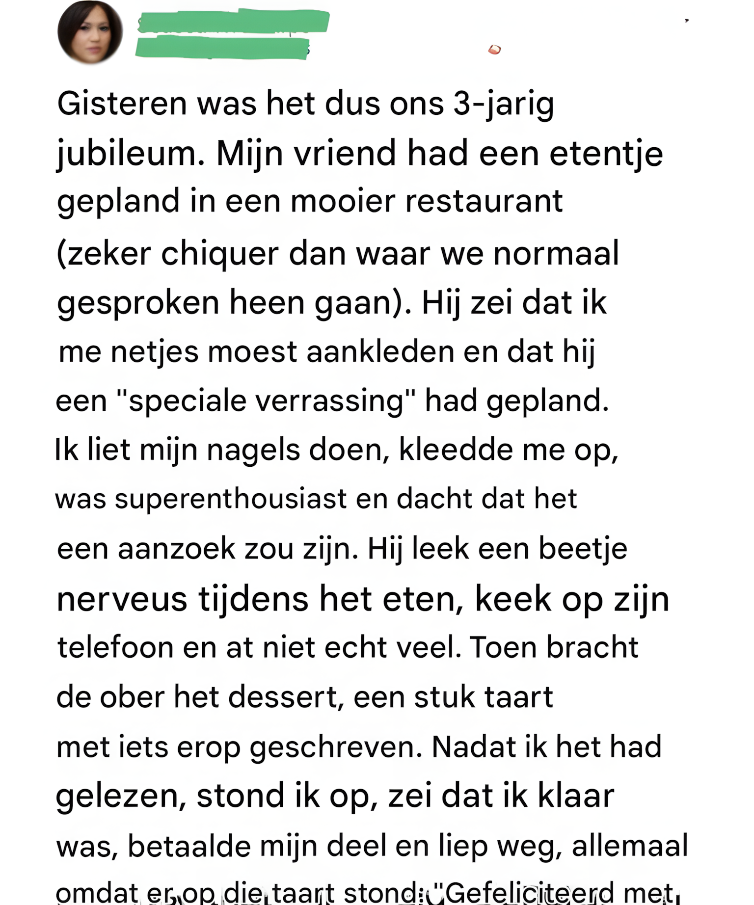Maar in plaats van een ring, werd het dessert geserveerd met een bordje waarop stond: « Gefeliciteerd met je promotie! » Alleen… ik had de promotie niet gekregen.