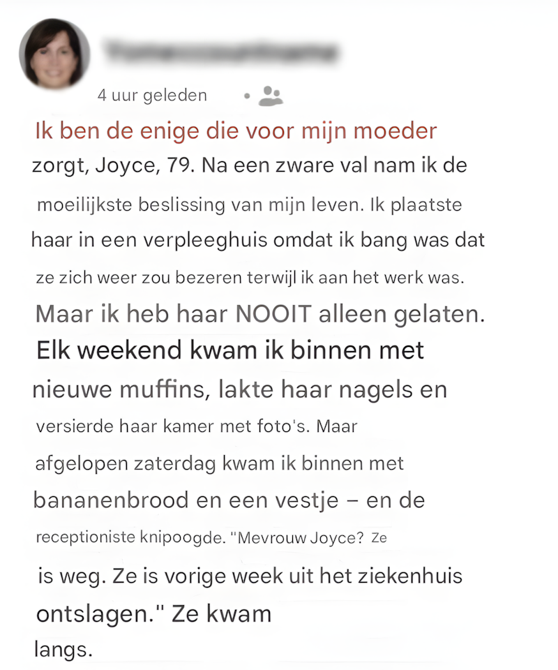 « Mijn bejaarde moeder is mogelijk zonder de juiste toestemming ontvoerd. Stuur me een privébericht als je haar hebt gezien. »