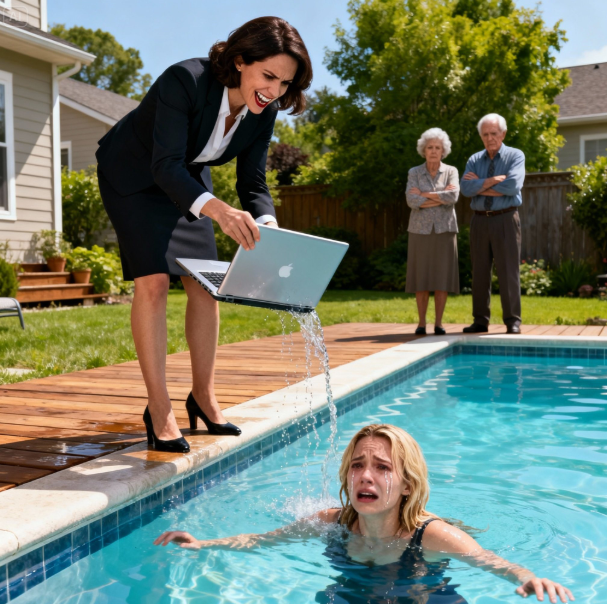 Ik weigerde mijn zus 20.000 dollar te lenen, dus gooide ze mijn laptop recht in het zwembad. Daarna glimlachte ze en zei: « Oeps, mijn hand gleed uit. » En mijn ouders? « Het was gewoon een ongelukje. » Ze hadden geen idee dat die laptop mijn hele carrière vertegenwoordigde. Ik huilde niet, ik maakte geen ruzie. Die avond zette ik alles op slot. De volgende ochtend om 6:15 werd ze wakker en bleek alles leeg te zijn. En dat was nog maar het begin.