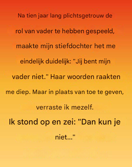 Ze zei het als een lichtschakelaar: « Je bent mijn vader niet. » Het heeft me niet gestoord. Het heeft me gewoon kapotgemaakt. Tien jaar haar leren fietsen, niet slapen tijdens koorts, schoolvoorstellingen bijwonen, haar geschaafde knieën verbinden, haar eerste gebroken harten verzachten—en ik was nog steeds gewoon « Mike. » Dus probeerde ik iets anders. Ik heb niet toegegeven. « In dat geval, » zei ik zo kalm mogelijk, « kun je me niet als een bokszak behandelen en verwachten dat ik glimlach daarom. » Haar ogen werden groot. Ze was het niet gewend dat ik stond. Ze stootte hem om, sloeg de deur dicht – het einde van de scène. Ja…