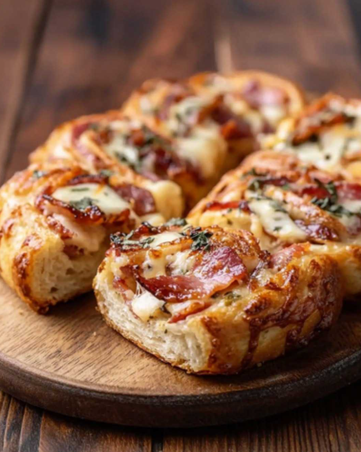 De broodjes in elkaar zetten: Verwarm je oven voor tot 180°C (350°F). Rol het bladerdeeg uit op een werkblad. Smeer het deeg met een dunne laag crème fraîche. Daarna smeer ik het spek en de geraspte kaas gelijkmatig over het hele oppervlak. Kruid het licht met peper.