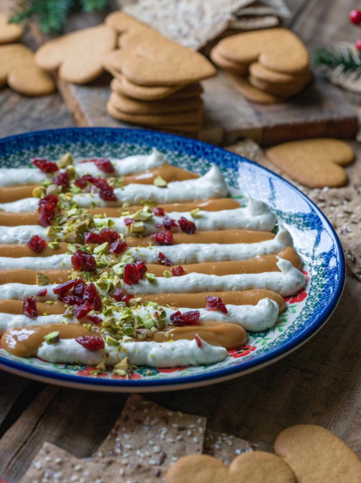 Fredrik koos ervoor de dip op te spuiten zodat er mooie strepen en een speels patroon ontstaan. Dit geeft een feestelijke uitstraling, perfect voor de kersttafel. Maar je kunt het mengsel net zo goed in kleine torentjes scheppen, uitstrijken in een schaal of creatief presenteren in glaasjes of op een serveerbord. Het is een zeer veelzijdige dip die er op verschillende manieren elegant uitziet.