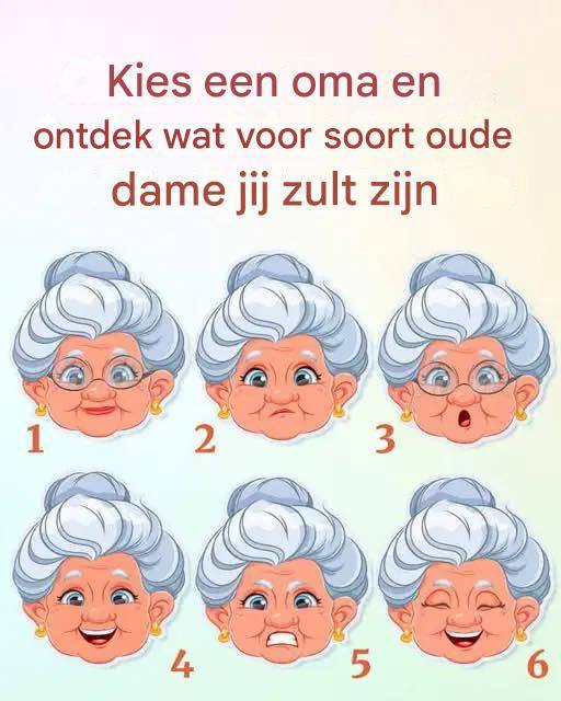 Ouder worden is een reis vol wijsheid, ervaringen en, laten we eerlijk zijn, grappige eigenaardigheden. Of we het nu leuk vinden of niet, we transformeren allemaal naarmate we ouder worden en ontwikkelen unieke eigenschappen die onze gouden jaren kenmerken. Deze speelse afbeelding daagt je uit om een oma te kiezen en te ontdekken wat voor soort oudere vrouw je zou kunnen worden. Dus, welke spreekt jouw toekomstige zelf aan? Laten we het ontdekken!