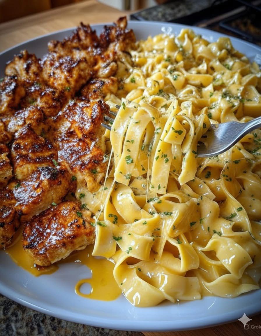 Kipfettuccine met knoflook, boter en romige driekazensaus
