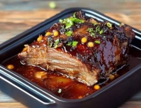 Lamsschouderconfit met knoflook, honing en mosterd