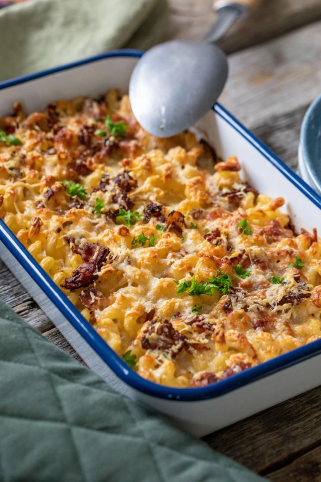 Gebruik bij voorkeur gewone macaroni in plaats van instant-varianten; die laatste worden vaak te zacht en verliezen makkelijk hun structuur. Met goede, stevige macaroni behoudt de schotel zijn bite en wordt hij precies zoals bedoeld – rijk, maar nooit papperig.
