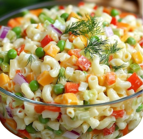 Voeg de afgekoelde macaroni, selderij, rode ui, geraspte wortels en optionele ingrediënten (erwten, paprika’s of spek) toe aan de saladekom met de dressing. Meng alles voorzichtig door elkaar tot het goed bedekt is.