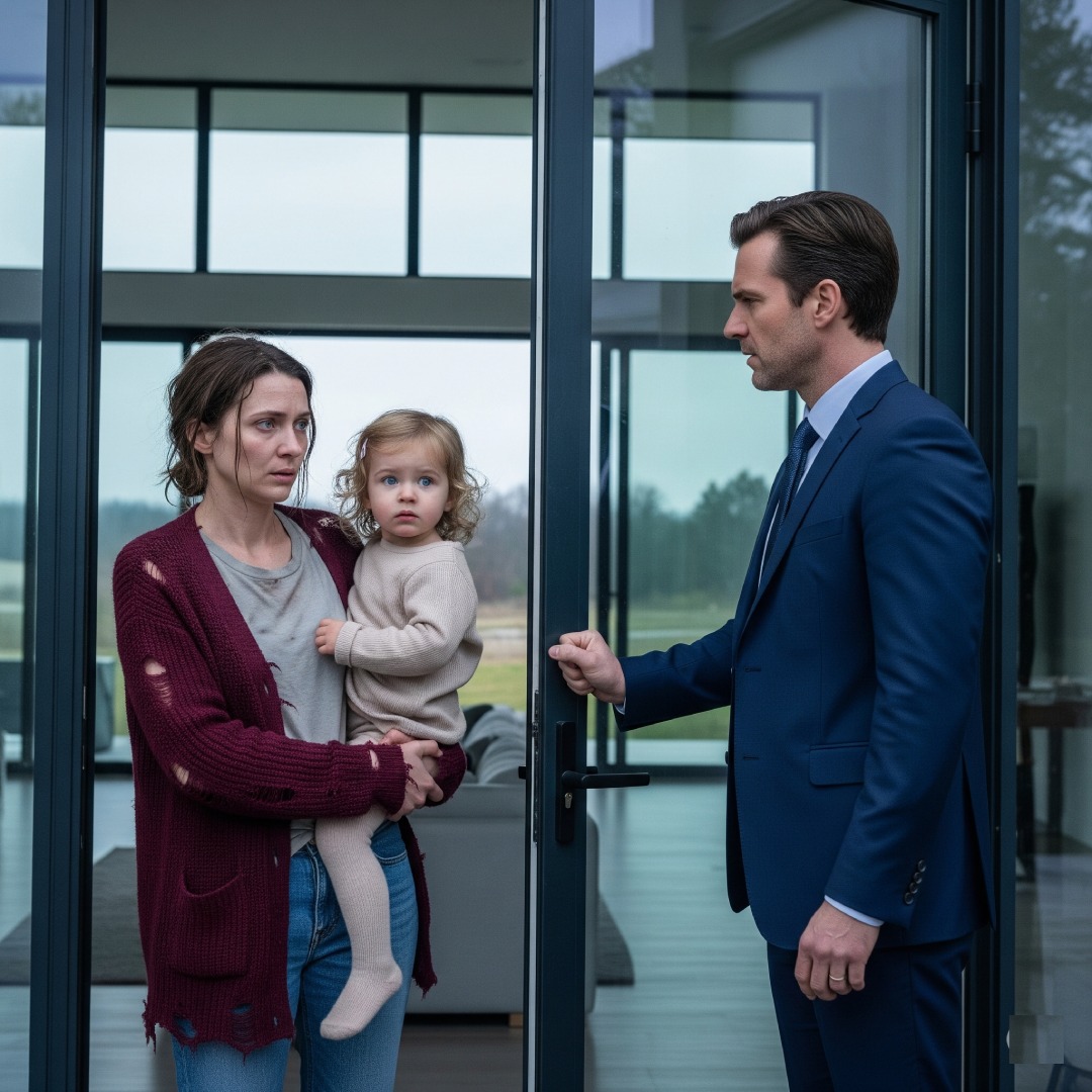 Haar vest zat vol gaten, jeans vervaagde en haar haar hing vochtig tegen haar bleke gezicht. In haar armen hield ze een klein meisje vast — niet ouder dan twee — met grote blauwe ogen die de zijne weerspiegelden.