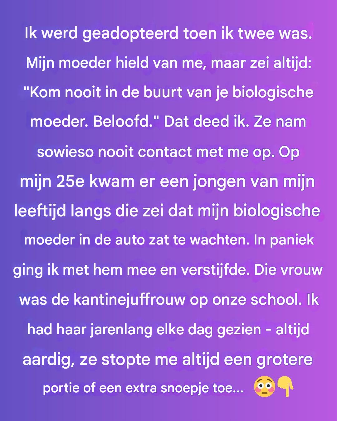 « Kom nooit in de buurt van je biologische moeder. Beloof het me, » zei ze dan, terwijl haar stem een beetje trilde.