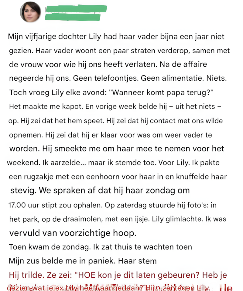 Toen ik Lily alleen op een bankje zag zitten, met haar teddybeer stevig tegen haar borst gedrukt, keek ze me met grote, vermoeide ogen aan en fluisterde: « Mam, kunnen we nu naar huis? »
