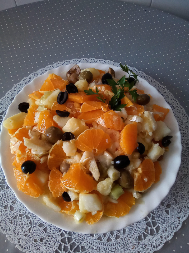 Omdat elke chef zijn eigen methode heeft, kook ik de aardappelen meestal terwijl ze nog warm zijn. Ik voeg een scheutje olie toe. Ik heb de gehakte lente-ui in het schaaltje. Ik meng de aardappelen, kabeljauw en olijven erbij. Ik heb het een paar uur laten