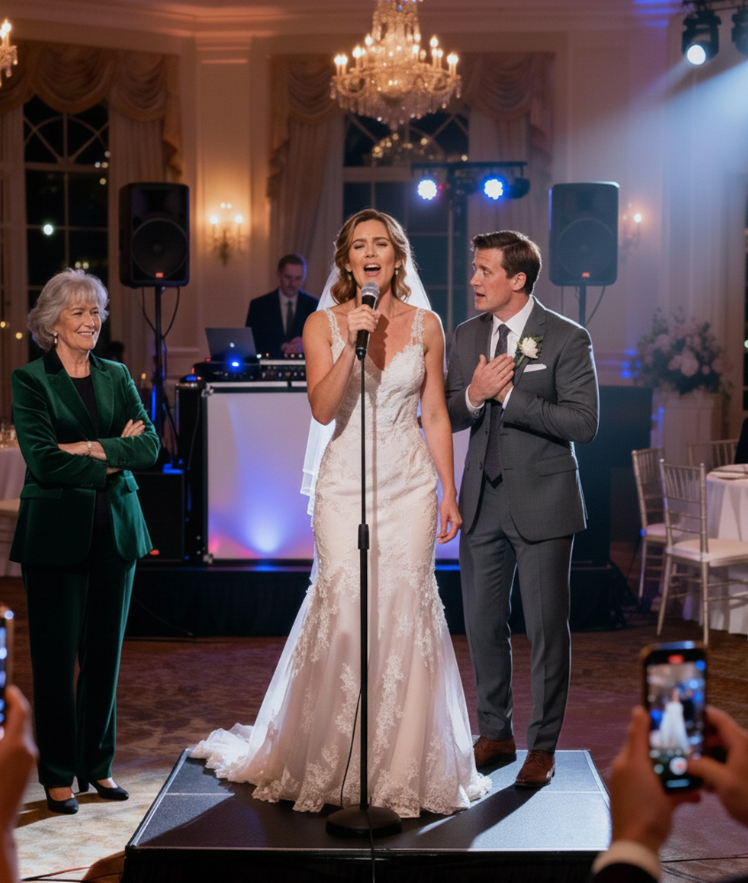 Mijn schoonmoeder wilde me op onze bruiloft voor schut zetten. Ze pakte de microfoon, stopte de muziek en grijnsde, terwijl ze zei: « Ga je gang. Zing zonder backingtrack—laat ons zien wat je echt kunt. » Een golf van opwinding ging door de kamer toen mensen hun telefoon omhoog hielden, klaar om te zien hoe ik zou instorten. Mijn keel kneep samen, mijn handen trilden, en mijn man boog zich voorover en mompelde: « Je hoeft dit niet te doen. » Ik schudde mijn hoofd en liep toch naar voren. « Oké, » zei ik. En op het moment dat ik begon te zingen, verdween het gelach—want ze hadden geen idee dat ik op veel grotere podia had gestaan dan dat.
