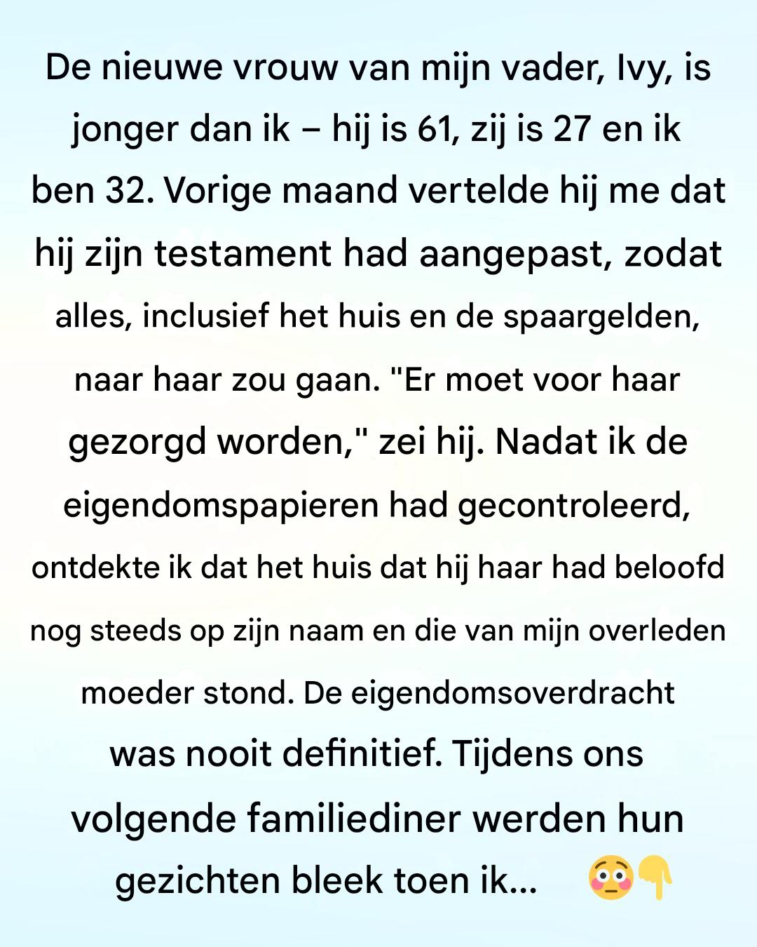 De nieuwe vrouw van mijn vader, Ivy, is jonger dan ik – hij is 61, zij is 27 en ik ben 32. Vorige maand vertelde hij me dat hij zijn testament had bijgewerkt, zodat alles – het huis, het spaargeld, alles – naar haar zou gaan.