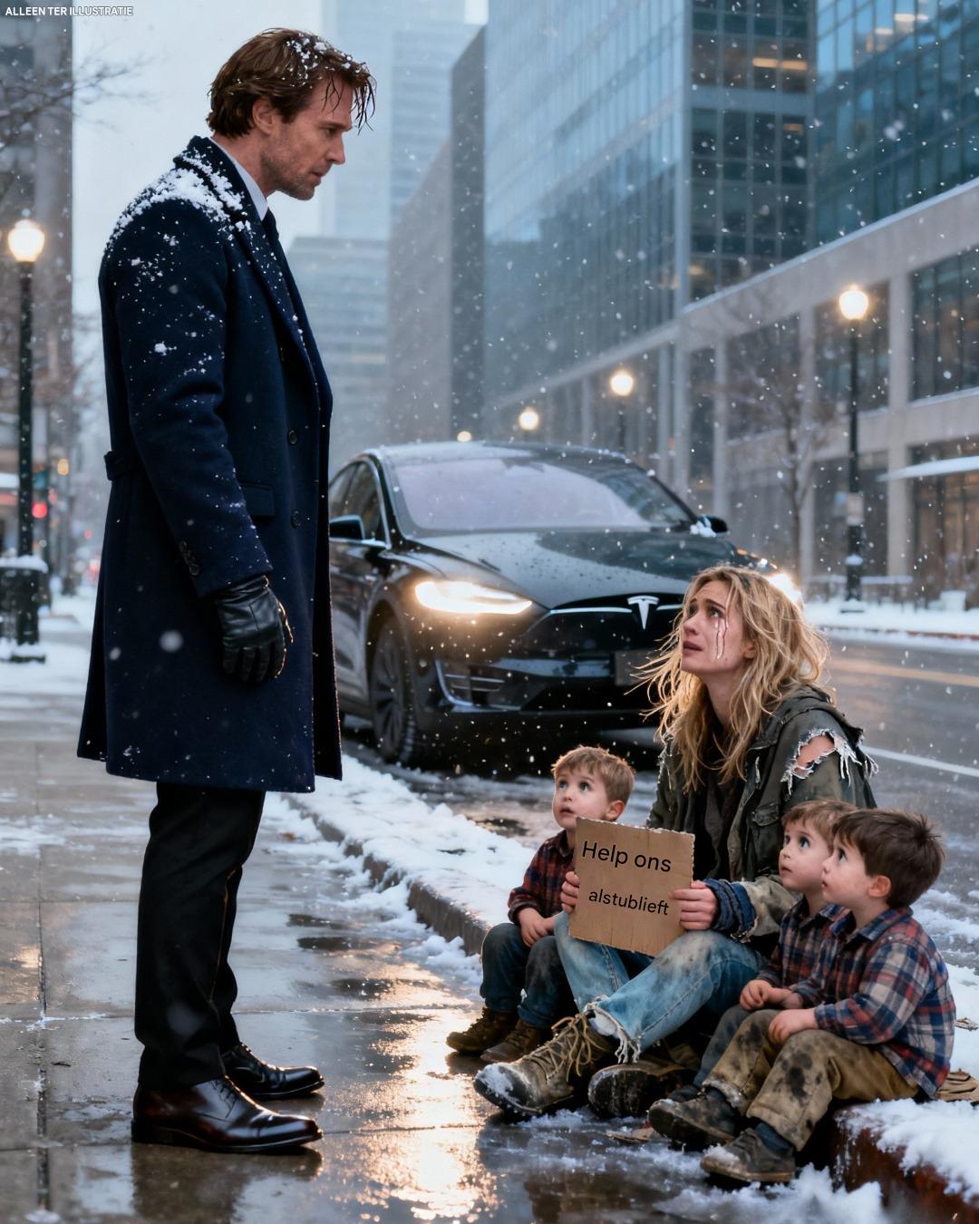 Bij de stoeprand, gewikkeld in een dunne deken, zat een vrouw met drie kleine kinderen dicht tegen zich aan gedrukt voor de warmte. De vrouw hield een kartonnen bordje vast met de tekst: Help ons alstublieft. Alles helpt. Alleen al de aanblik was hartverscheurend, maar wat Liam volledig deed bevriezen, was haar gezicht.