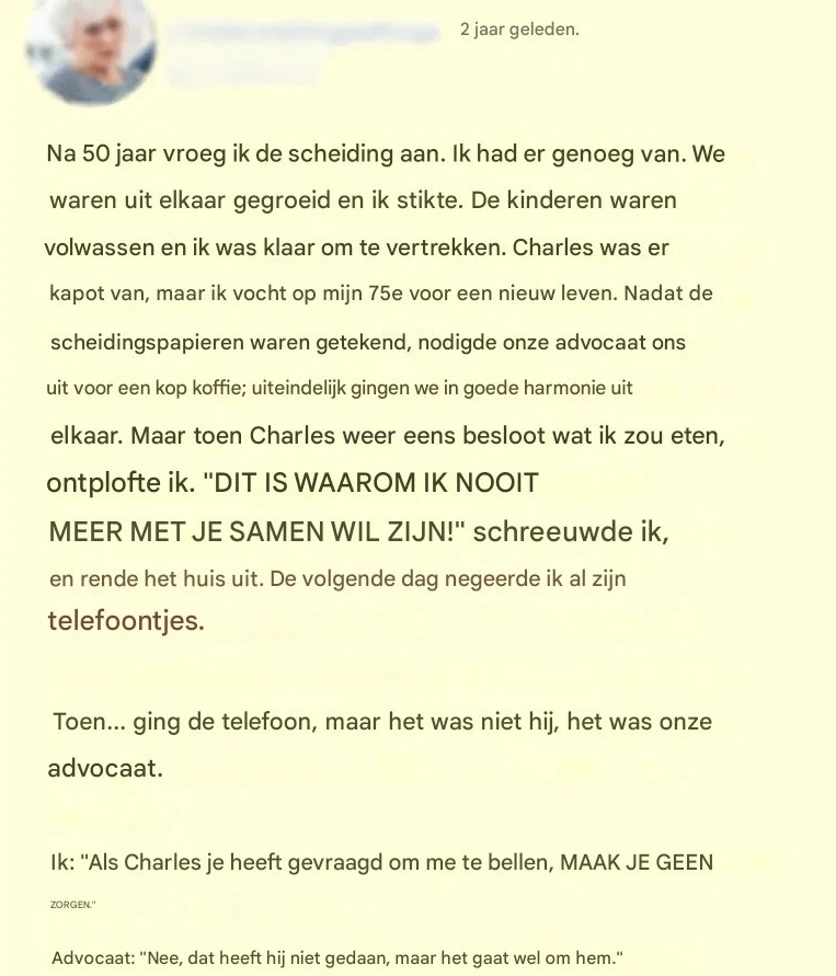 Charles was er kapot van, maar ik vocht op mijn 75e voor een nieuw leven. Nadat de scheidingspapieren waren getekend, nodigde onze advocaat ons uit voor een kop koffie; uiteindelijk besloten we in goed overleg uit elkaar te gaan.