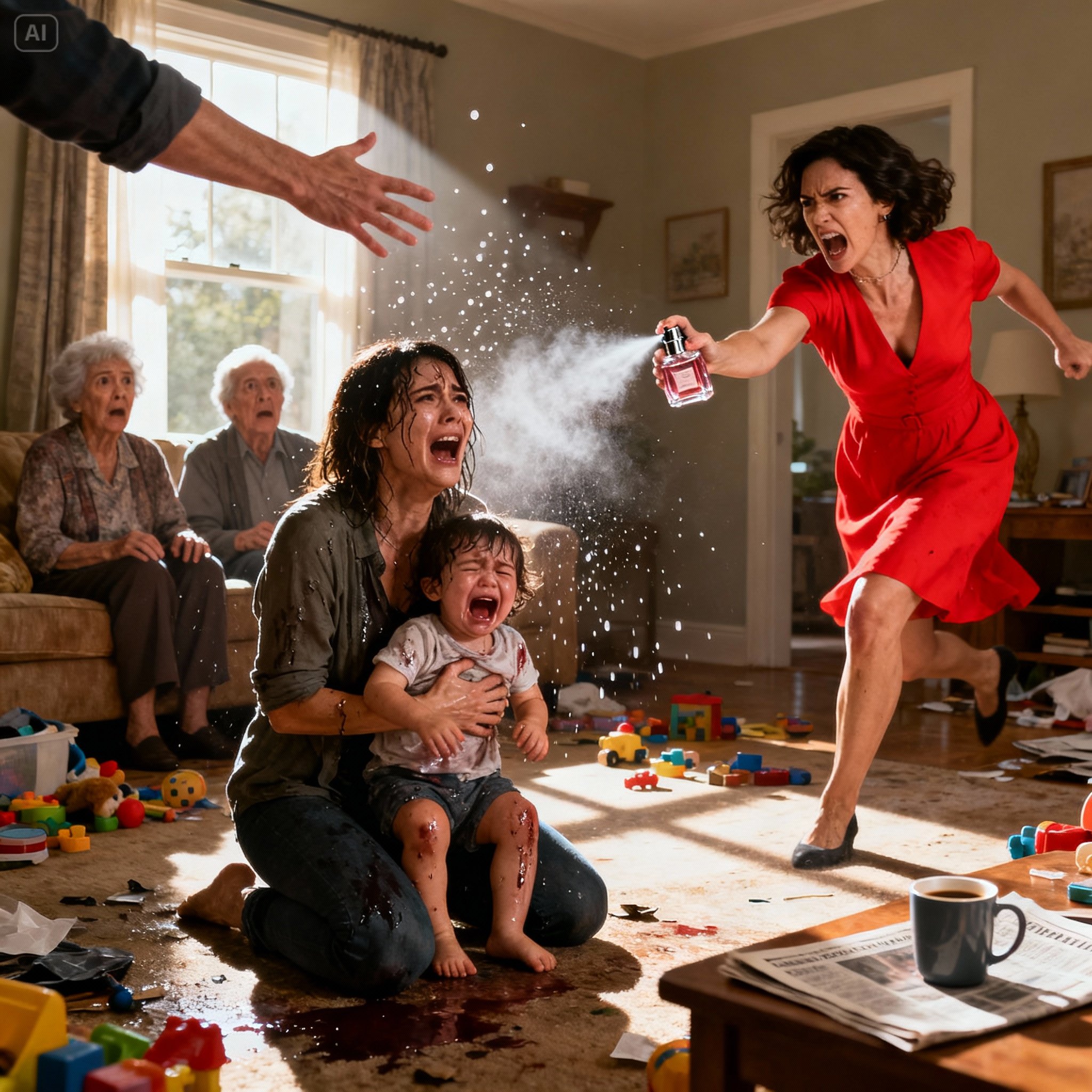 De zoete geur van het parfum vermengde zich met Leo’s gesmoorde kreet. Hij was amper acht jaar oud en zijn blauwe ogen vulden zich met tranen toen hij het brandende gevoel voelde. Zijn tante, Clara, lachte nerveus. « Het was maar een grapje, » mompelde ze, terwijl het jongetje wanhopig over zijn oogleden wreef. Maar wat het meeste pijn deed, was niet het prikken, maar het lachen dat erop volgde.