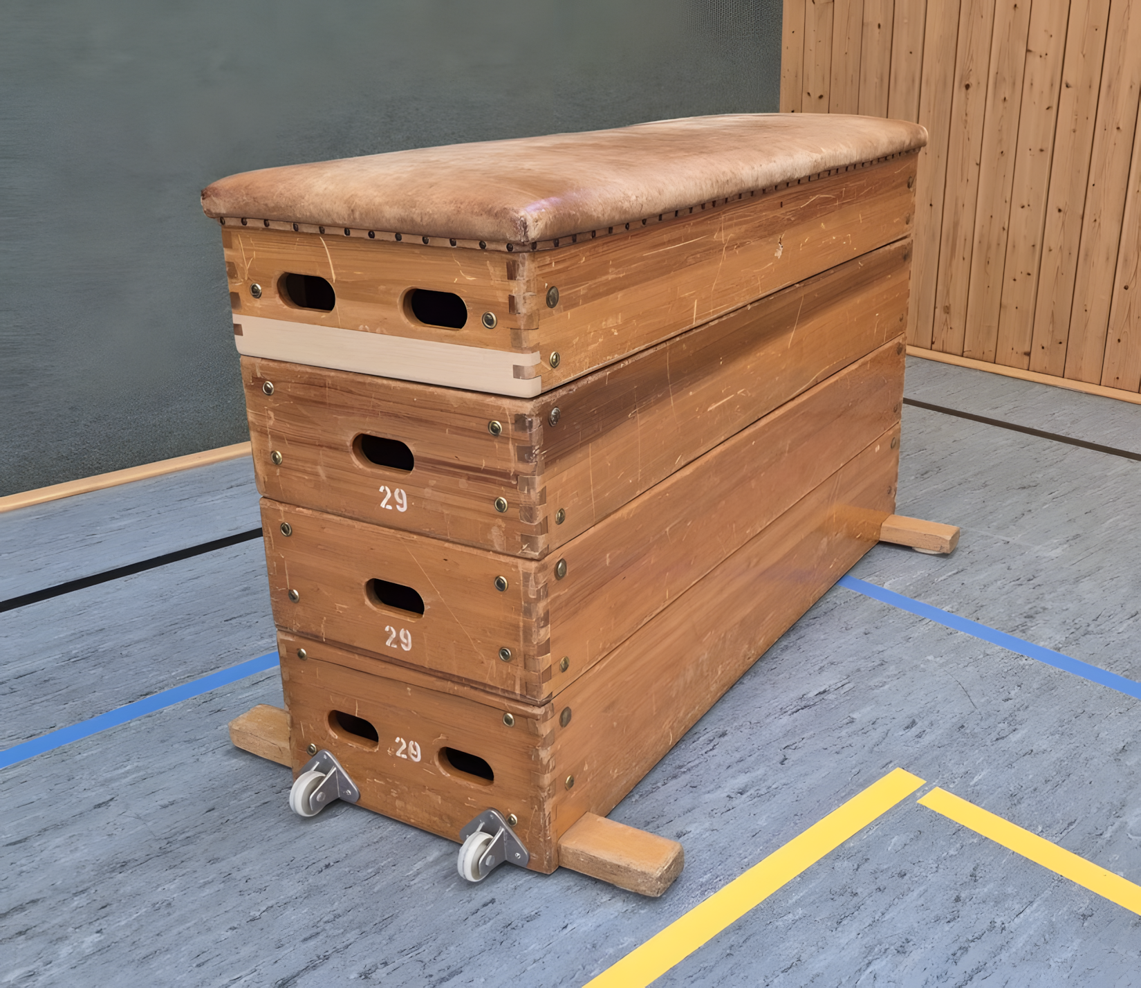 Je kijkt naar een wat oude foto, iets vergeeld, duidelijk genomen in een gymzaal. Achterin staan houten rekken tegen de wand en er ligt een mat op de grond. In het midden staat er een vreemd object: het is bruin, bekleed met leer en heeft houten poten. Misschien denk je aan een meubelstuk, een oude kist, of zelfs een kunstobject.