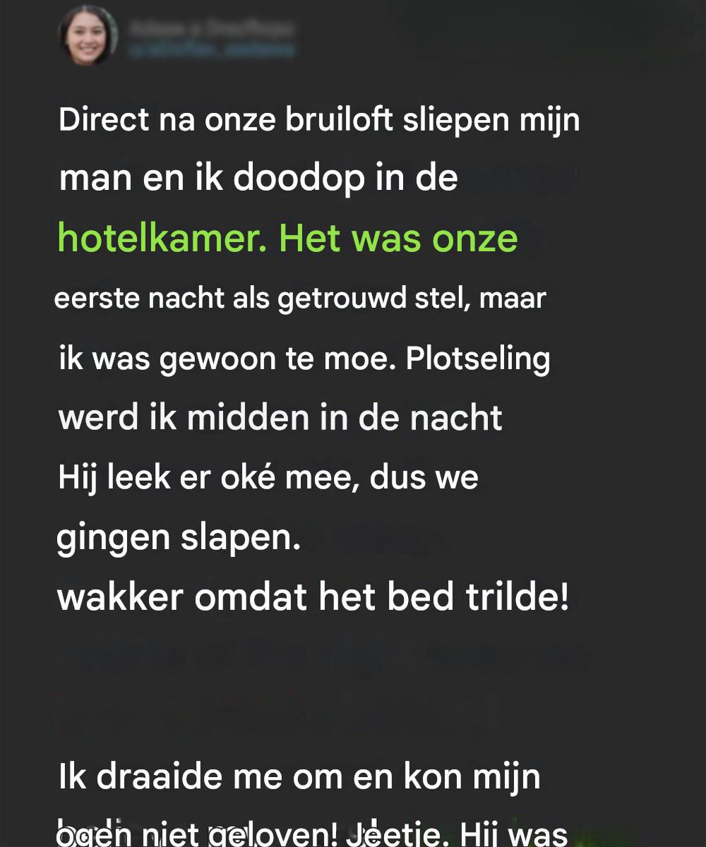 Ik dacht dat we ons in een rustige nacht hadden gevestigd. Maar uren later werd ik wakker met het geluid van beweging en het vreemde gevoel van ons bed dat schudde.