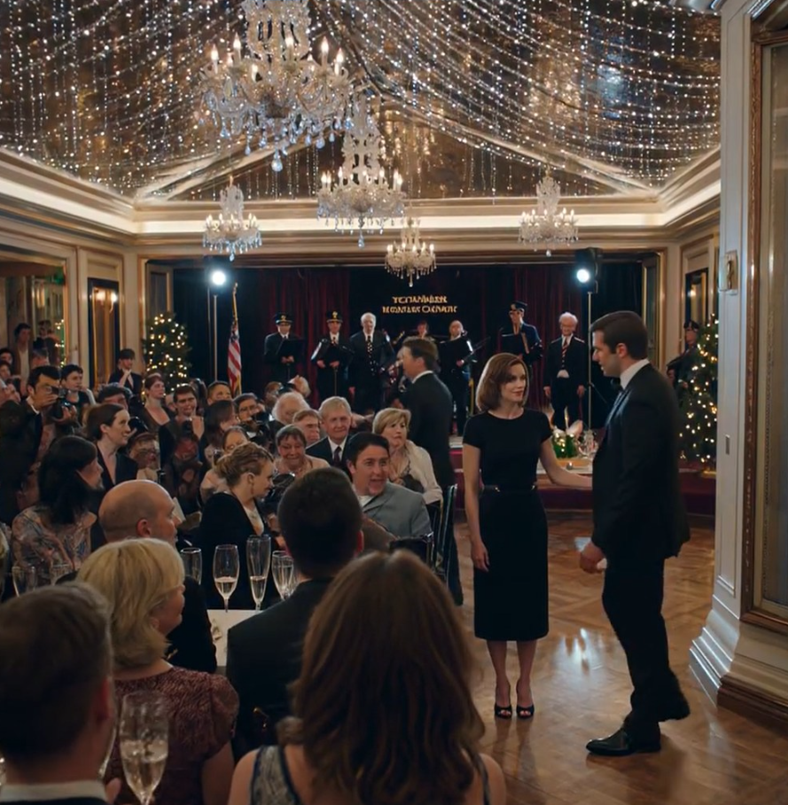 Ik stond daar met een leeg dienblad in mijn handen, de glazen zoemden nog zachtjes van de echo van haar stem. We waren in de balzaal van een hotel in Manhattan, versierd als een winteransichtkaart, vol witte rozen en glazen ijspegels, op een kerstliefdadigheidsgala in volle bloei. Jazz neuriede op de achtergrond met de drukte van gesprekken. Fotografen cirkelden als satellieten rond de kamer, wachtend tot iemand belangrijks struikelde.