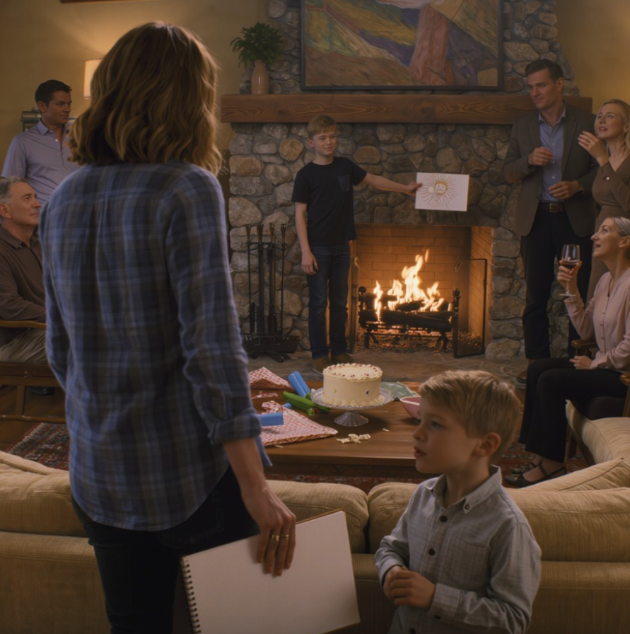 Ik keek haar recht in de ogen. « Ik ga niet tussen mensen zitten lachen terwijl het werk van mijn kind in rook opgaat, » zei ik. « Gefeliciteerd met je verjaardag. »