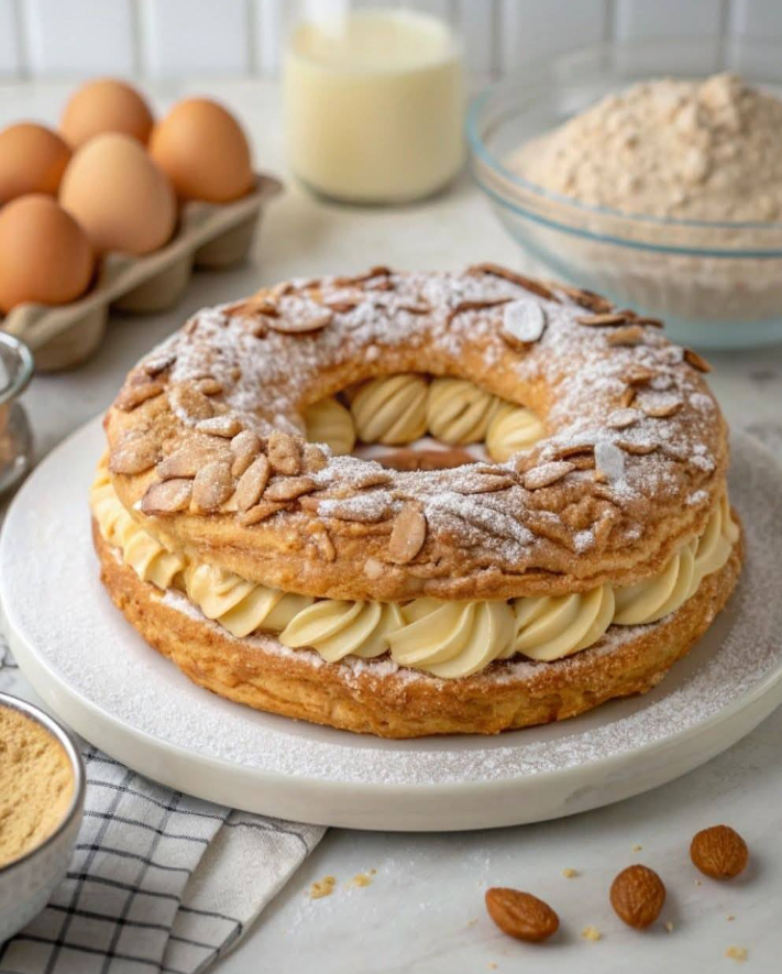 Paris-Brest is een essentieel symbool van Frans gebak, een dessert dat even elegant als gastronomisch is. Bestaande uit een licht chouxdeeg en een romige pralineroom, verleidt het met zijn balans tussen knapperigheid, zoetheid en aromatische rijkdom.