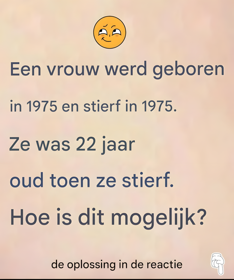 Stel je voor: je komt deze vreemde zin tegen terwijl je door je nieuwsfeed scrolt. « Een vrouw werd geboren in 1975 en stierf in 1975. Ze was 22 jaar oud. » Je staat perplex. Onbegrijpelijk? Verontrustend? Er zit duidelijk ergens een addertje onder het gras… Maar waar? Houd je vast, want dit raadsel daagt onze logica en onze reflexen uit en vereist een vleugje verbeeldingskracht. Wat als de sleutel nu juist was om niet zoals gewoonlijk te denken?