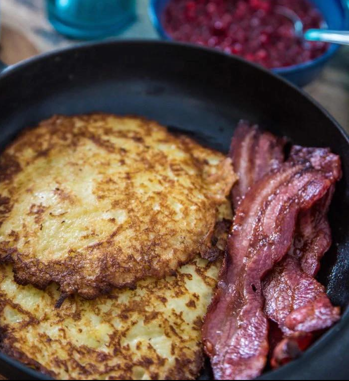 - Serveer: Serveer de raggmunks met het gefrituurde varkensvlees en rauwe bosbessen voor de perfecte smaakbalans.
