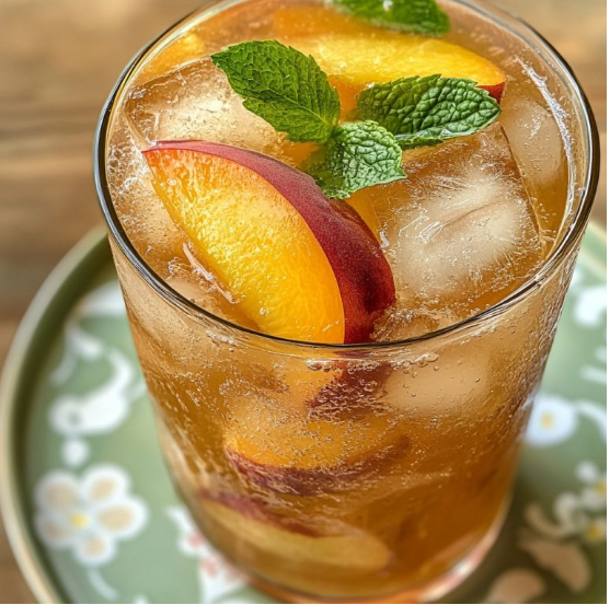 Als je klaar bent om te serveren, versier je elk glas met ijsblokjes, een paar plakjes perzik en verse muntblaadjes.