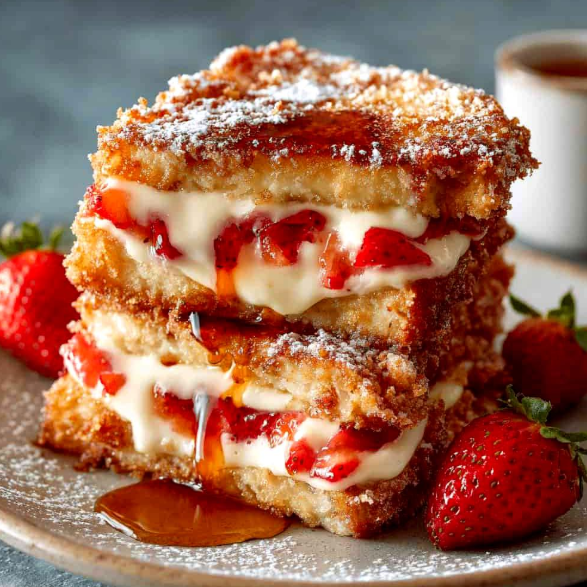 Deze geroosterde aardbeiencheesecake sandwiches zijn de perfecte balans tussen warme, knapperige toast en zachte, romige cheesecakevulling. Verse aardbeien geven een explosie van zoetheid, waardoor het een heerlijke traktatie is die net zo makkelijk te maken is als heerlijk. Of je ze nu serveert als ontbijt, dessert of als zoete snack, deze sandwiches zullen een hit zijn bij iedereen die houdt van de combinatie van romige cheesecake en vers fruit.