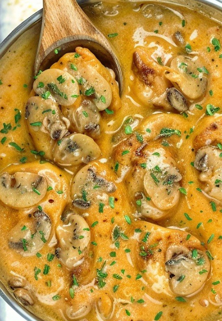 textuurcontrast: zachte kip en romige saus met licht gebakken champignons