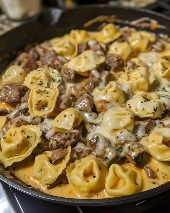 Een romig, smaakvol pastagerecht met zachte tortellini, sappig vlees en een rijke kaassaus – perfect voor een luxe, hartverwarmende maaltijd!