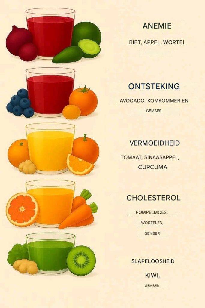 Probeer het eens: maak vandaag een sapje tegen bloedarmoede: mix een kleine biet, een appel en een wortel met een kopje water en zeef het eventueel. Drink langzaam en als je last hebt van slapeloosheid, mix dan ‘s avonds een kiwi met een schijfje gember. De dynamische presentatie van de afbeelding suggereert een wekelijkse gewoonte, gecombineerd met een gezond dieet en rust.