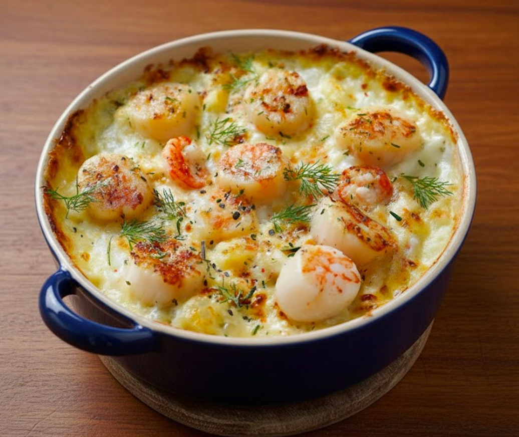 Als je denkt aan een gerecht dat elegantie, zoetheid en mariene smaken combineert, is de gratin met sint-jakobs- en garnalen een natuurlijke keuze. Het is een recept vol verfijning, ideaal voor speciale gelegenheden zoals de eindejaarsvieringen, een romantisch diner of een familiediner die iets chiquer is dan normaal. De delicate geur, smeltende textuur en de knapperige au gratin-top maken het tot een gerecht dat zowel het oog als de smaakpapillen verrukkt.