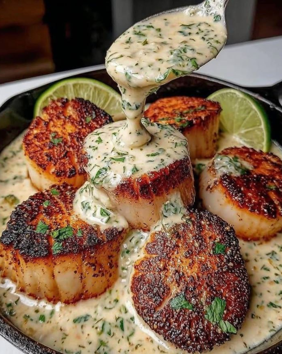 Sissende sint-jakobsschelpen met pittige limoenkoriandersaus