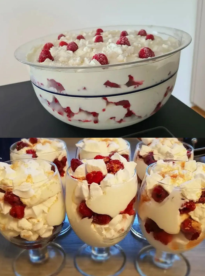 Deze romige “sneeuwdouche” is een verrassend eenvoudig dessert dat zowel luchtig als fris smaakt. Dankzij de combinatie van magere kwark, roomkaas, mascarpone en een vleugje witte chocolade ontstaat een heerlijk zachte textuur die perfect in balans wordt gebracht door de frisse frambozen. Het resultaat is een nagerecht dat er feestelijk uitziet, snel te bereiden is en altijd indruk maakt. Ideaal voor onverwachte visite of wanneer je in weinig tijd toch iets bijzonders op tafel wilt zetten.