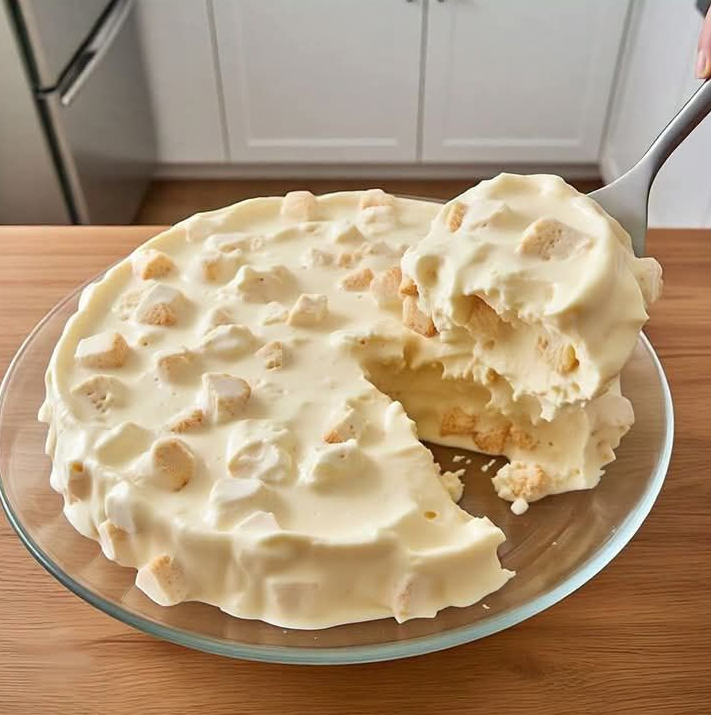 Giet het mengsel in een kom en voeg de grof gesneden koekjes toe. Roer alles tot het gemengd is.