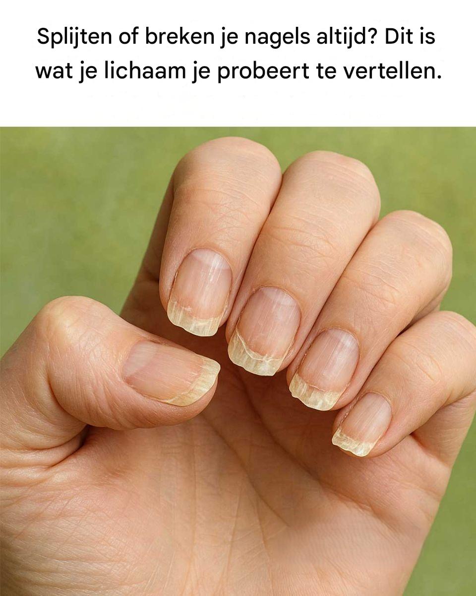 Splijten en breken van nagels, medisch bekend als onychoschizia, kan door verschillende factoren worden veroorzaakt. Regelmatige blootstelling aan water, agressieve chemicaliën of schoonmaakmiddelen kan de nagels verzwakken en ze gevoeliger maken voor beschadiging. Bovendien kan fysiek trauma, zoals nagelbijten of nagelgebruik als gereedschap, leiden tot splijten. Gezondheidsaandoeningen zoals schildklieraandoeningen, psoriasis of schimmelinfecties kunnen de integriteit van de nagels ook aantasten. Bovendien kunnen voedingstekorten, met name aan vitaminen en mineralen zoals biotine, ijzer en zink, bijdragen aan broze nagels.
