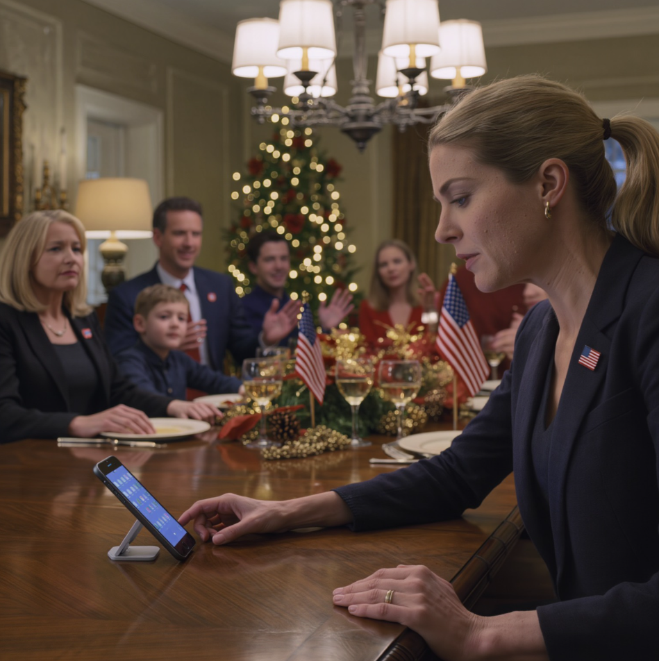 Papa zat aan het hoofd van de tafel, recht als een i. Een man van uitspraken, nooit van vragen. Hij droeg zijn kersttrui als een harnas — een nuchter model met discreet rendieren, duurder dan mijn eerste huur.
