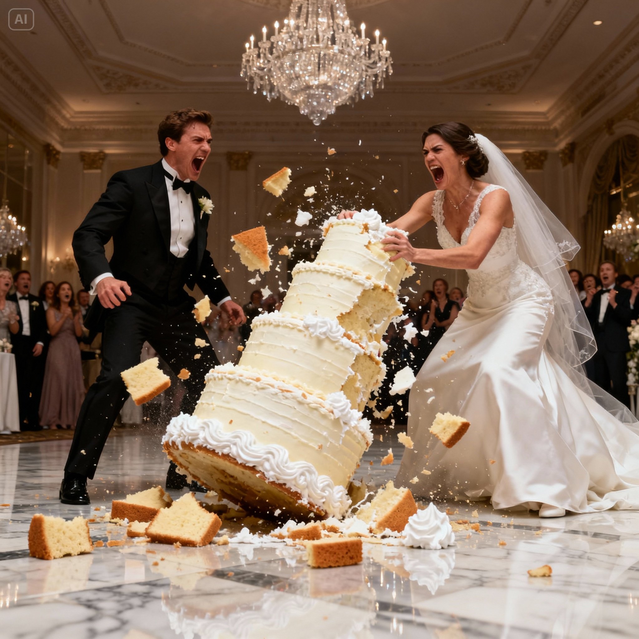 Het was tijd om de taart aan te snijden. Een torenhoog, zeven verdiepingen tellend architectonisch wonder van fondant en suiker, bekroond met bladgoud.