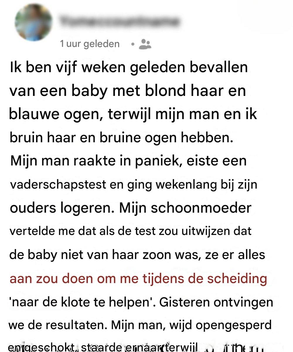 Hij liep weg, eiste een DNA-test en ging bij zijn ouders wonen, waar zijn moeder me zonder aarzeling waarschuwde dat als het kind niet van hem was, ze de scheiding zo wreed mogelijk zou maken. Gisteren kwamen de uitslagen eindelijk binnen, en de uitdrukking op het gezicht van mijn man toen hij ze las, veranderde alles.