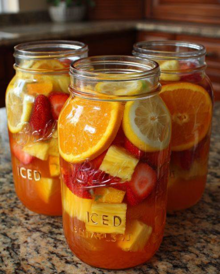 Voeg de plakjes aardbeien, stukjes ananas, sinaasappelschijfjes en citroenschijfjes toe aan de kan.