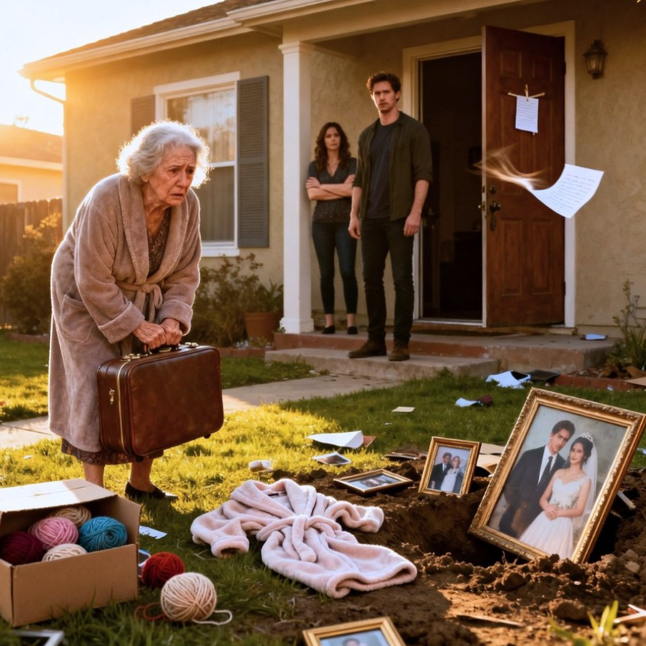 Mijn kleren lagen verspreid op het gazon. Mijn wollen dozen, mijn badjas, de ingelijste foto van mijn overleden man en mij: alles lag opgestapeld bij de oprit, alsof iemand de garage van een vreemde had leeggehaald.
