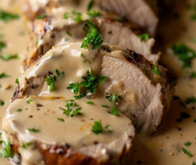 Langzaam gegaarde Varkenshaas met romige Dijonsaus
