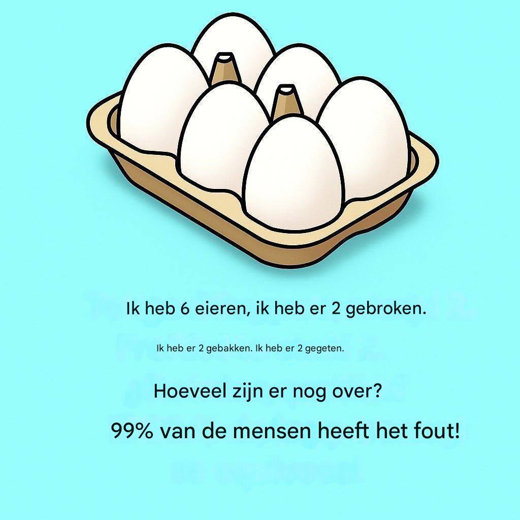 « Ik heb 6 eieren. Ik heb er 2 gebroken, 2 gebakken en 2 opgegeten. Hoeveel eieren zijn er nog over? 99% van de mensen heeft het mis. »