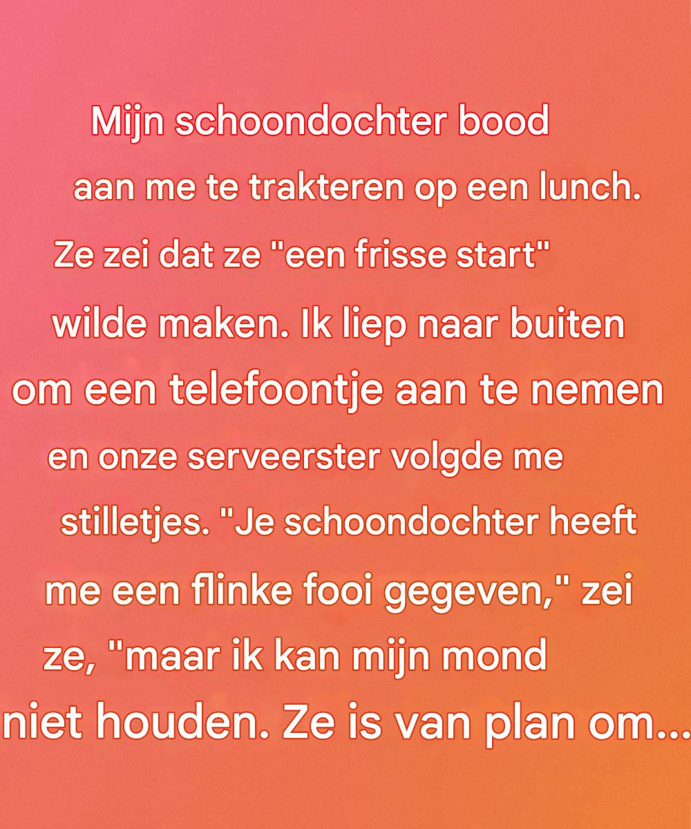 Ik leerde deze les op een onverwachte manier toen mijn schoondochter, Claire, me op een middag uitnodigde voor een lunch. Wat begon als een eenvoudige maaltijd samen, veranderde in een krachtige herinnering dat schijn bedriegt, maar eerlijkheid – hoewel pijnlijk – de kracht heeft om te genezen.