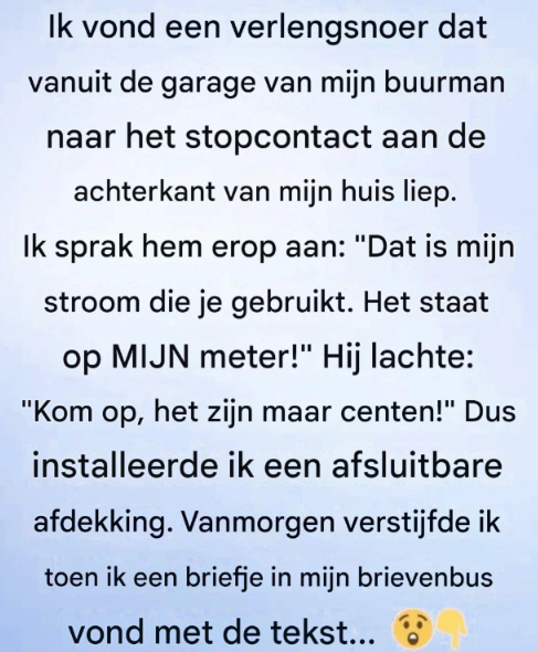 Later die dag besloot ik de situatie rustig aan te pakken. Ik zei tegen mijn buurman: « Hé, ik denk dat je per ongeluk je stekker in mijn stopcontact hebt gestoken – voor de duidelijkheid, dat loopt via mijn meter. » Hij lachte het weg en zei dat het « maar een beetje stroom » was, alsof dat het goedpraatte. Ik wilde geen spanning creëren, dus heb ik gewoon een klein afsluitbaar afdekplaatje op het stopcontact gezet – een simpele, respectvolle maatregel om toekomstige verwisselingen te voorkomen.